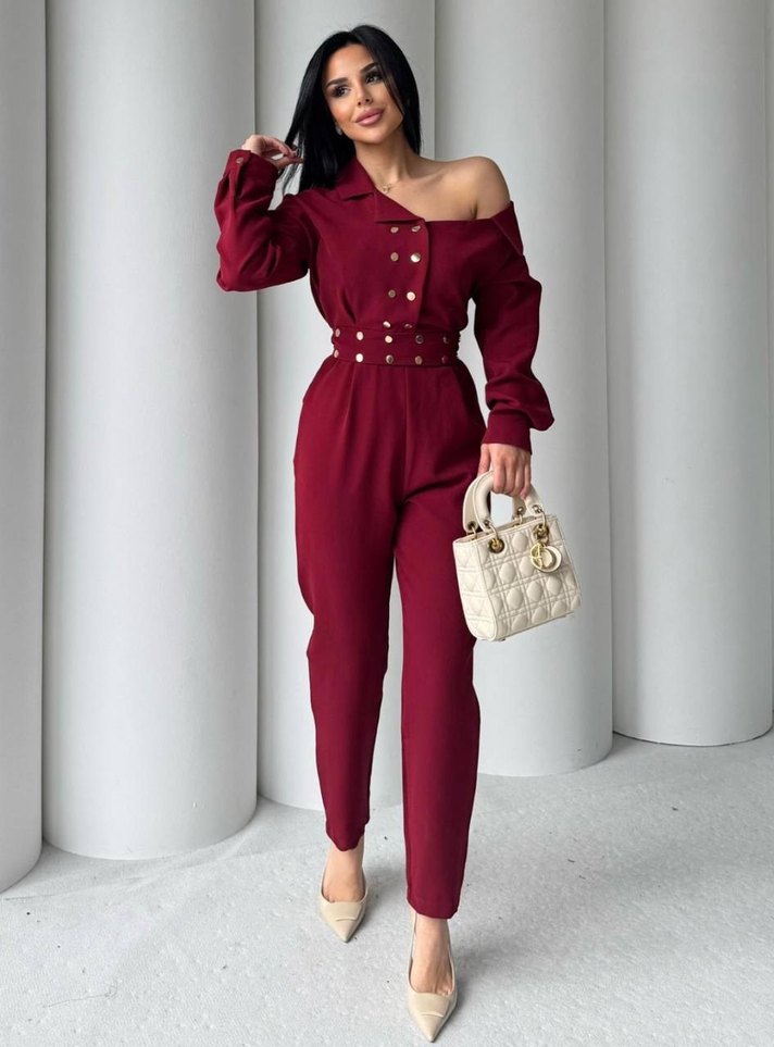 Bordo renkli uzun tulum, cıt cıtlı ve asimetrik tasarıma sahiptir. Straplez ve uzun kollu kombinasyonu, parlak görünümlü ve rahat kesimdedir. üründe kumaş defosu var yakın çekim görüntüleri son fotoğraflarda ürünün kemeri yok