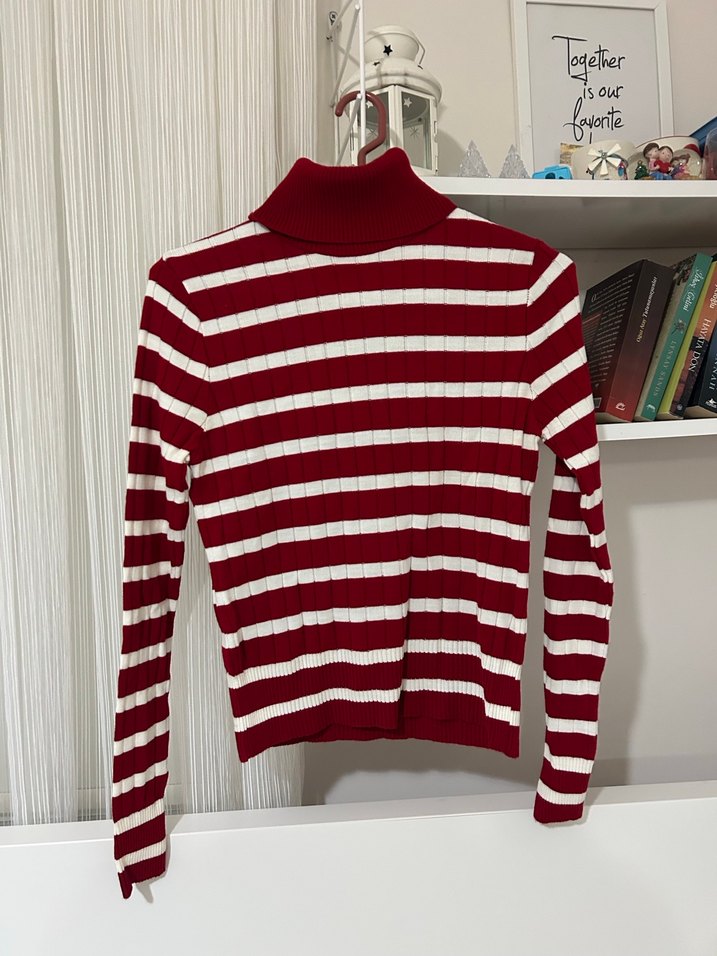 Bordo ve beyaz çizgili, boğazlı ve uzun kollu, vücuda oturan kadın kazak. Yumuşak örme kumaştan, günlük rahat Paris sokak modası tarzında.