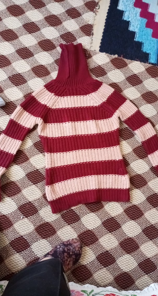 Bordo ve açık pembe çizgili, boğazlı ve uzun kollu, triko dokuma kumaştan yapılmış, uyumlu kesime sahip rahat bir kazak.