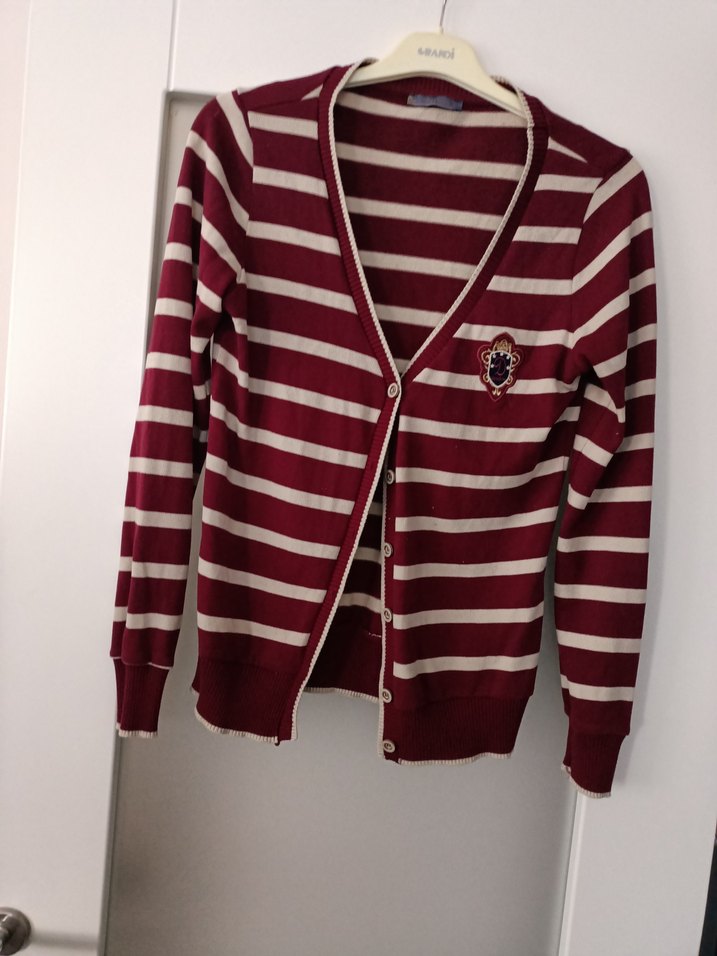 Bordo ve krem çizgili, düğmeli, ince örme kumaştan yapılmış, uzun kollu, normal midi boyda, dar kesim günlük kullanıma uygun hırka. iki koltuk altından göğüs ölçüsü mezro ile 46 cm boyu 64 cm