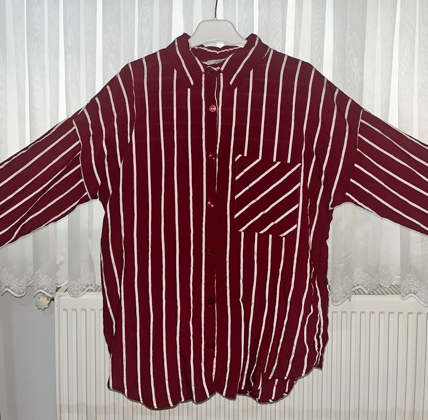 Bordo renkte,beyaz çizgili, tek cep ve düğmeli, salaş kesim kadın gömleği.