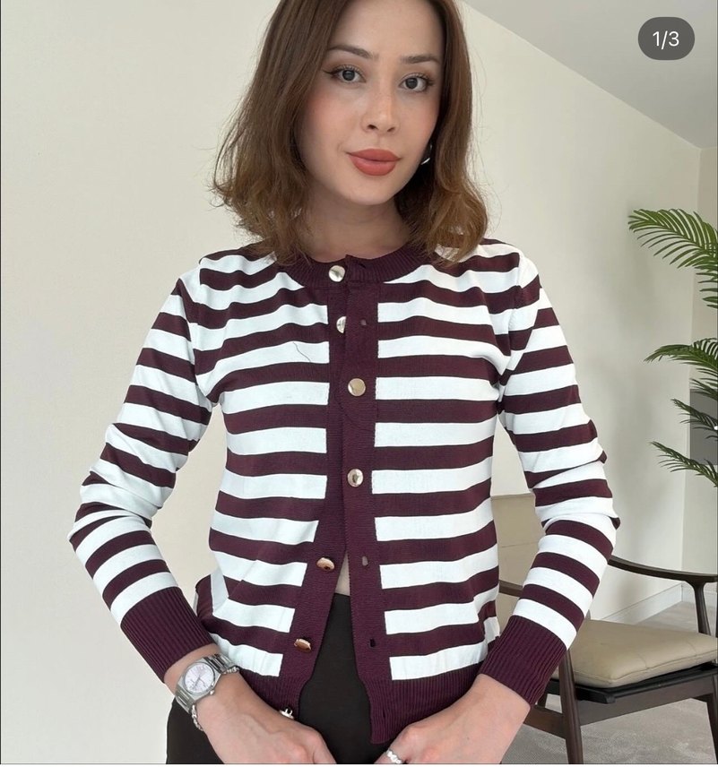 Bordo ve beyaz çizgili, düğmeli, uzun kollu, tekne yaka kadın hırka. Triko kumaştan, normal kesim ve midi boyda, günlük kullanım için uygundur.