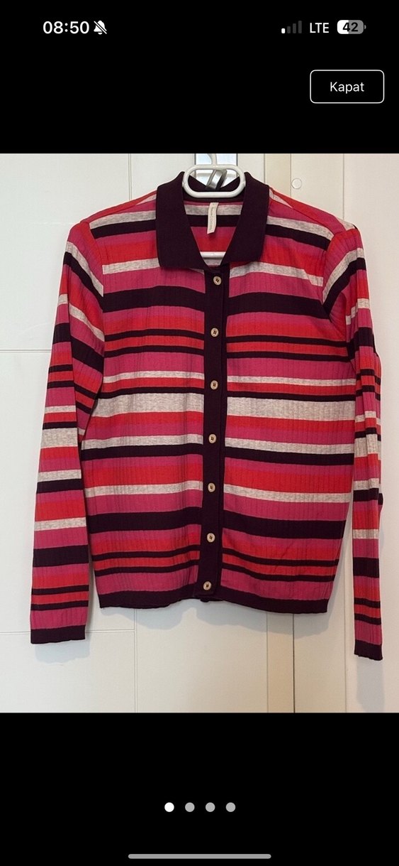 Bordo tonlarında çizgili, düğmeli, uzun kollu, yakalı ve bol kesim triko kadın hırkasıdır. Midi boyda, rahat bir kullanıma uygundur.