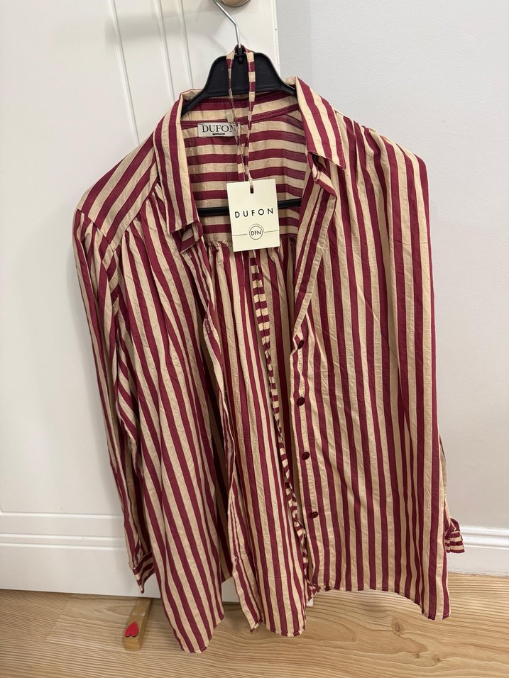 Bordo çizgili keten gömlek, uzun kollu ve yakası kesik detaylıdır. Bol kesim ve normal uzunluktadır, bohem sokak modasına uygundur. DUFON marka etiketlidir.