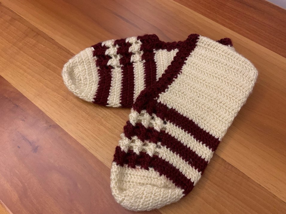 Bordo ve krem renkli çizgili, yumuşak dokulu örme erkek çorabı, rahatlık ve sıcaklık sağlar.