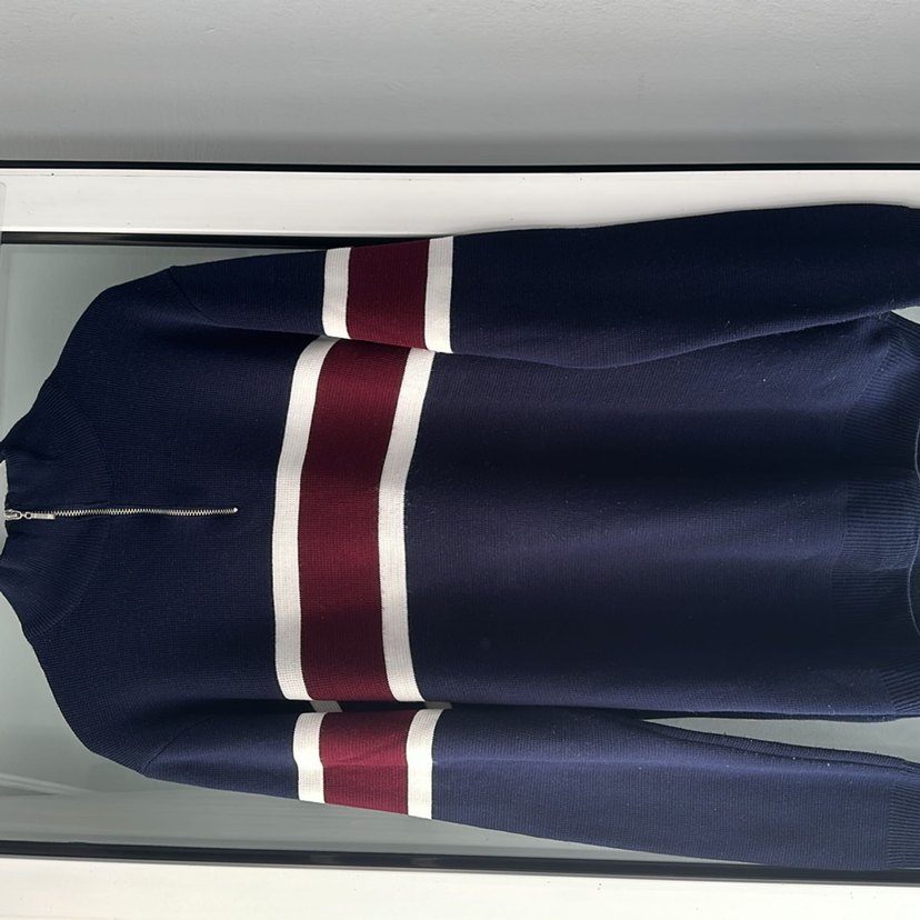 Bordo çizgili, fermuarlı, yüksek yakalı ve uzun kollu erkek sweatshirt. Normal kesim ve günlük kullanıma uygun rahat bir model.