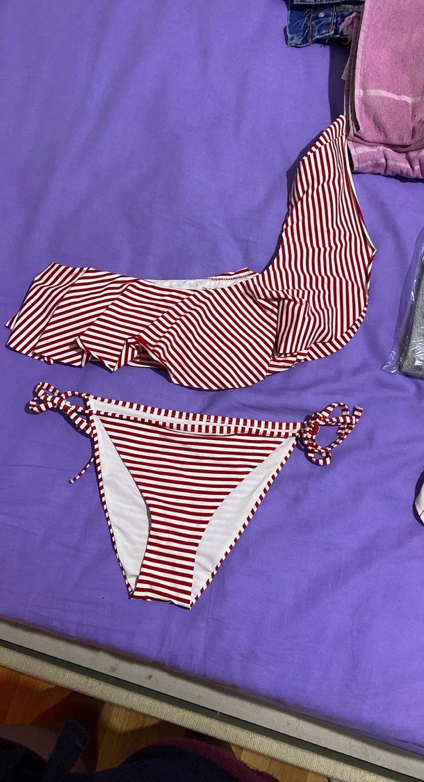 Bordo ve beyaz çizgili, askılı ve fırfırlı detaylara sahip, vücuda oturan kadın bikini, plaj için uygun.