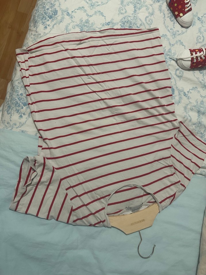 Bu hamile tişörtü, kısa kollu ve kayık yaka detaylıdır. Pamuk kumaştan yapılmış, bordo çizgili ve rahat kesimlidir. Günlük kullanıma uygundur. Orijinal