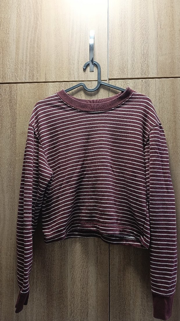 Bordo renkli, gri çizgili uzun kollu triko kazak. Yumuşak yün kumaştan, rahat kesimli ve günlük sokak stili için uygun.