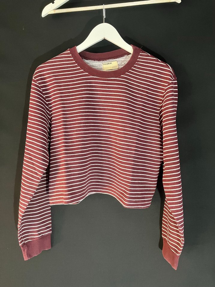 Bordo çizgili, uzun kollu, yuvarlak yaka, pamuklu triko kazak. Rahat kesimi ve normal boyu ile günlük kullanıma uygundur.