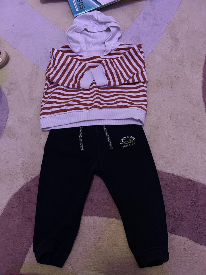 Bordo çizgili kapüşonlu, uzun kollu ve yuvarlak yakalı üst ile koyu renk, yumuşak ve sıcak kumaştan yapılmış eşofman takımı. Örgü dokusu konfor sağlar.