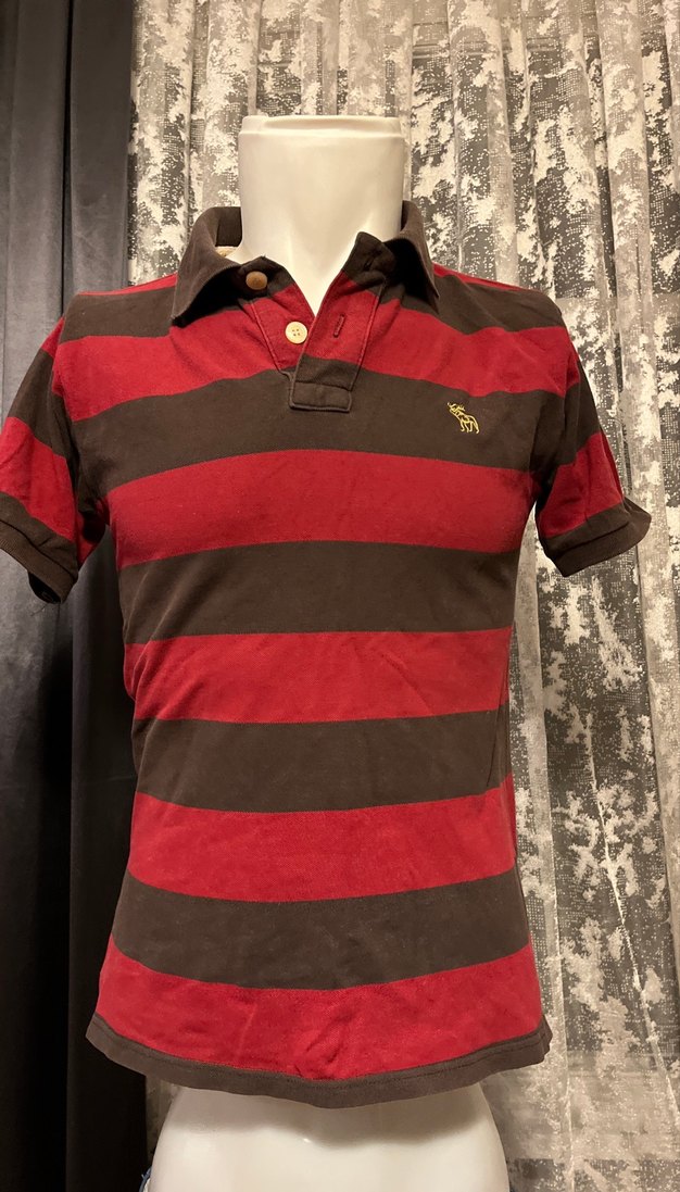 Bordo ve kahverengi çizgili, kısa kollu, yakalı ve düğmeli erkek polo tişört. Dar kesim ve yumuşak tekstil kumaştan, günlük rahat stil için uygundur.