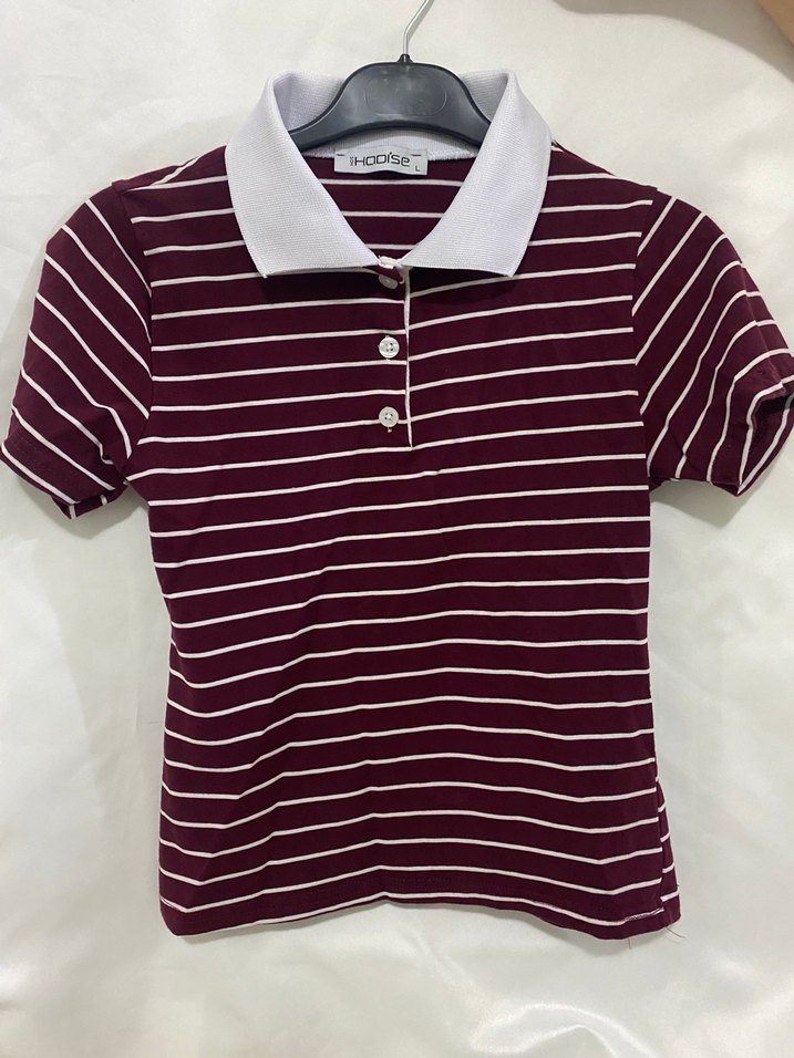 Kısa kollu, beyaz yakalı, düğmeli bordo çizgili kız polo tişört. Sentetik kumaştan, dar kesim, günlük sokak stili için uygundur.