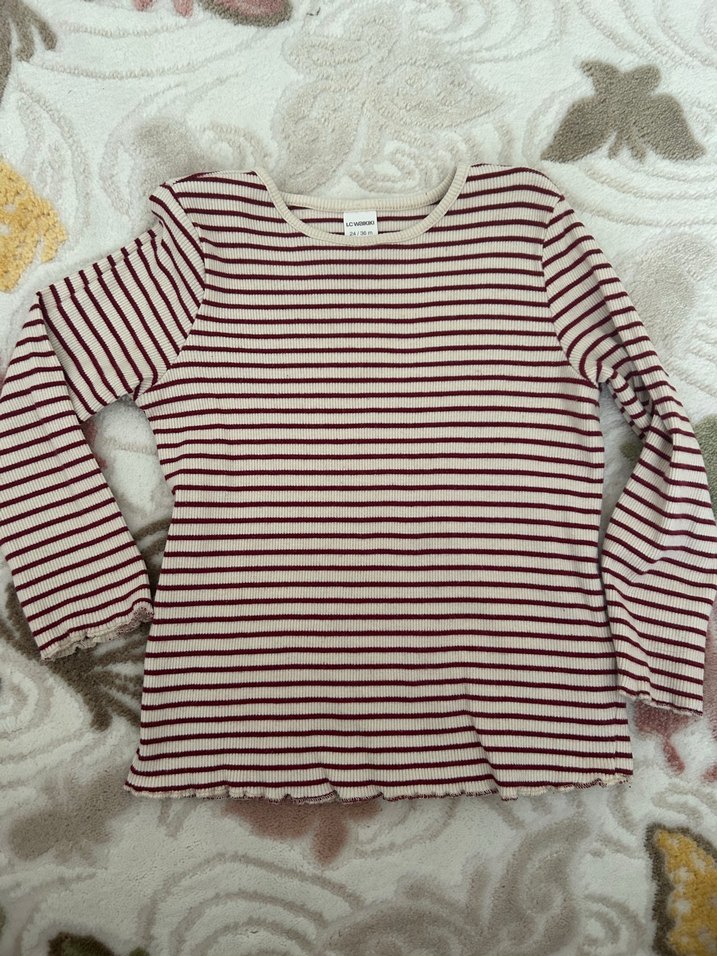Bordo pastel çizgili, uzun kollu, yuvarlak yakalı kız çocuk triko bluz, dar kesim ve rahat dokusuyla sokak stiline uygun.