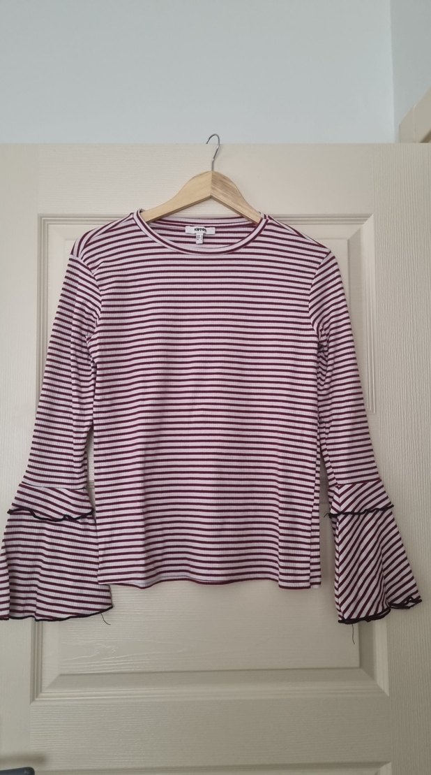 Bordo çizgili kız pamuklu bluz, uzun kollu ve bisiklet yaka. Pilili ve bol kesim kollarıyla rahat bir sokak stili sunar.