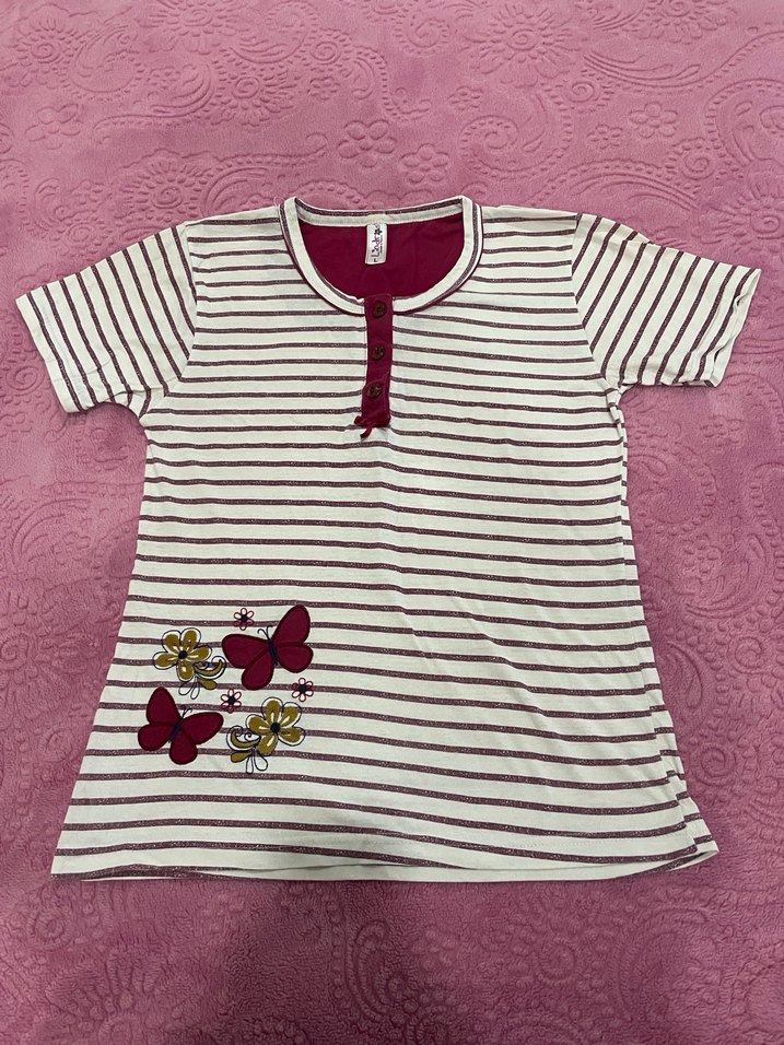 Bordo ve beyaz çizgili, kısa kollu, düğmeli tekne yaka, pamuklu kız tişörtü. Renkli kelebek ve çiçek baskılı, dar kesim.