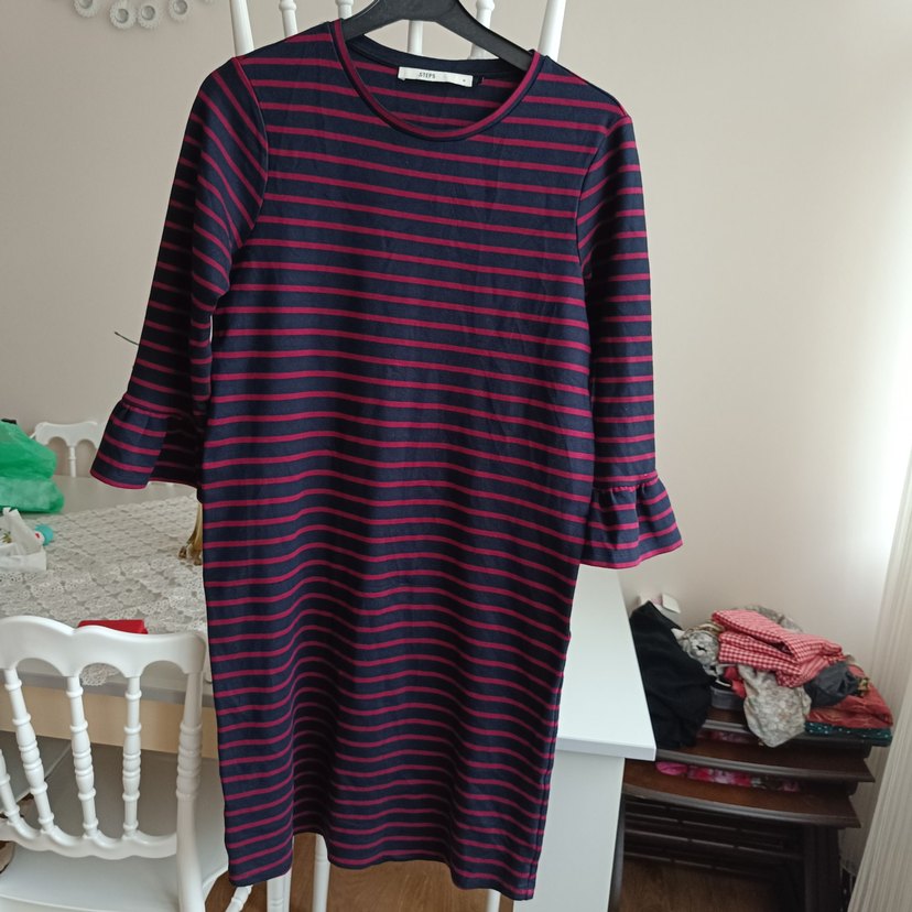 Bordo renkli, çizgili midi elbise, uzun kollu ve pileli manşetlere sahip. Salaş kesimi ve bisiklet yaka tasarımıyla gündelik kullanım için uygun. 40 beden ve 42 bedene kadar olur