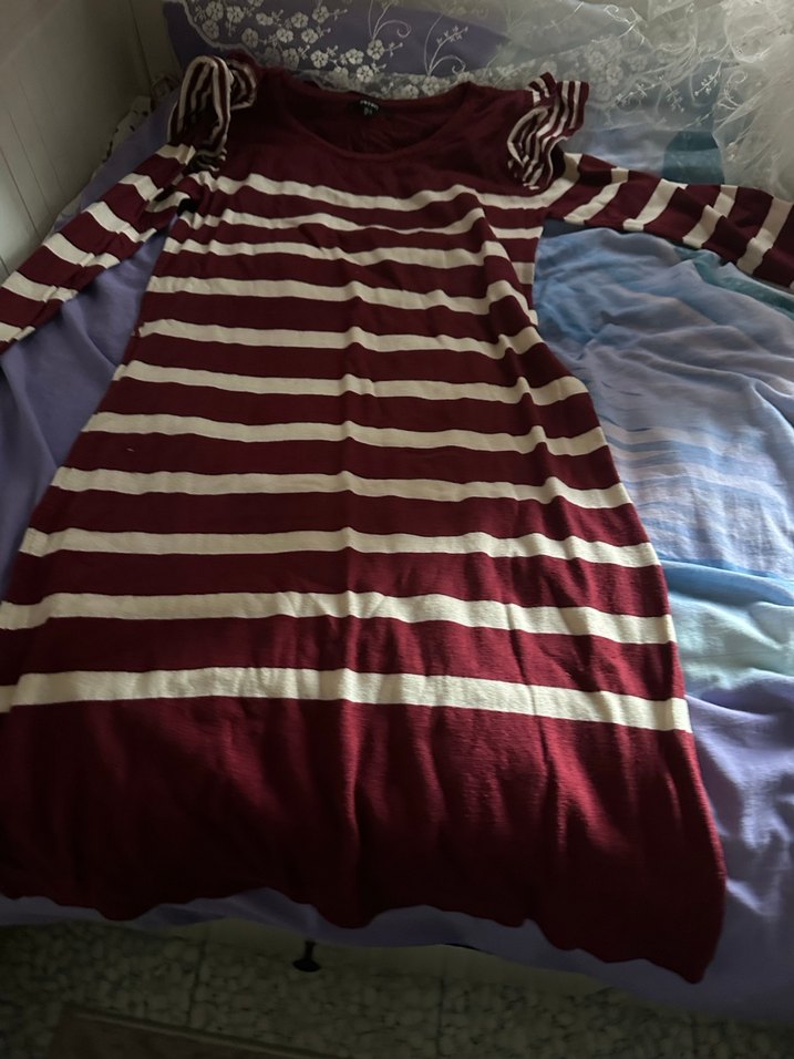 Bordo ve krem çizgili, uzun kollu, oturan kesim midi tunik. Kayık yaka ve drapeli detaylarla rahat sokak stili için uygun.