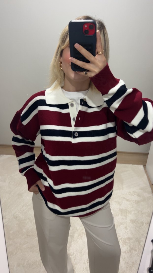 Bordo renkli, çizgili örme triko, uzun kollu ve yakalıdır. Bol kesimiyle rahat bir görünüm sunar.