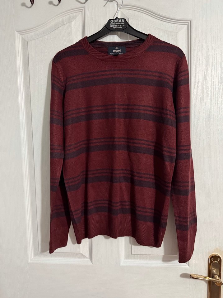 Bordo renkli, uzun kollu ve yuvarlak yakalı bu kazak, rahat kesimi ve çizgili deseniyle yumuşak yün malzemeden üretilmiştir.