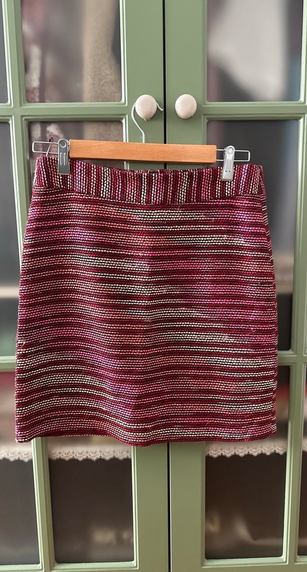 Bordo renkli, parlak çizgili ve triko kumaştan yapılmış, bohem tarzda, rahat ve vücuda oturan mini etek. Günlük kullanıma uygundur. İçinde bordo renkli astarı mevcut. Sadece 2 kere giyildi.