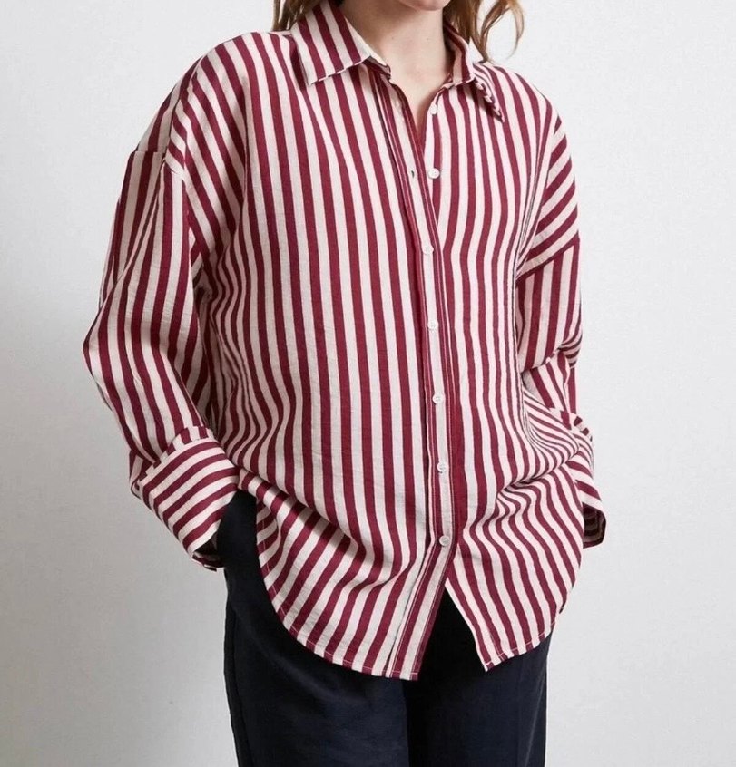 Bordo çizgili, düğmeli ve kayık yaka uzun kollu gömlek. Yumuşak keten kumaştan yapılmıştır, günlük kullanıma uygundur. Rahat kesimlidir.