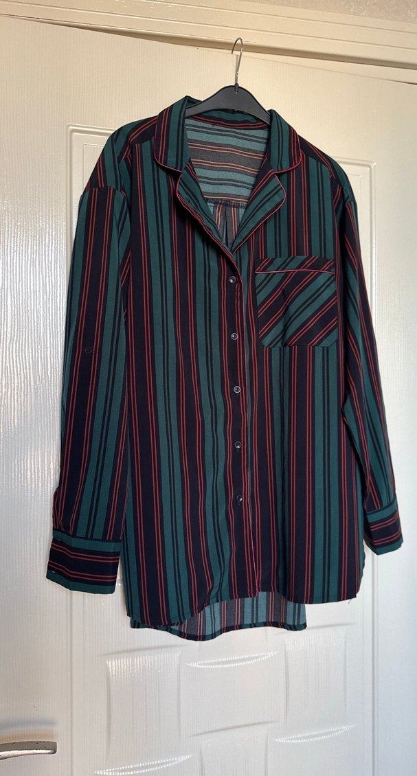 Bordo ve koyu tonlarda çizgili, düğmeli, uzun kollu, notched lapel yakalı, midi boy bol kesim kadın gömleği. Rahat sentetik kumaştan üretilmiştir.