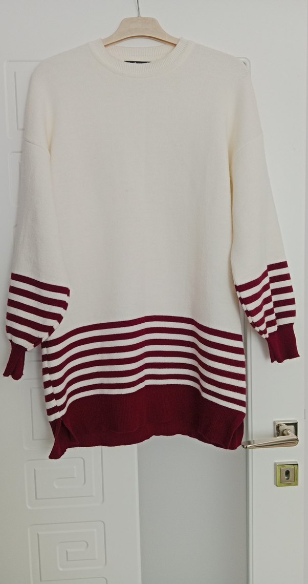 Uzun boylu, salaş kesim, bordo ve beyaz çizgili kollar ve etek ucu bulunan triko kazak. Yuvarlak yaka ve yumuşak örgü kumaştan yapılmıştır. Yanları küçük ten yırtmaçlıdır görselde göründüğü gibi