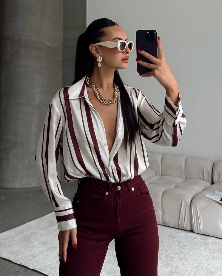 Bordo Çizgili Uzun Kollu Saten Gömlek