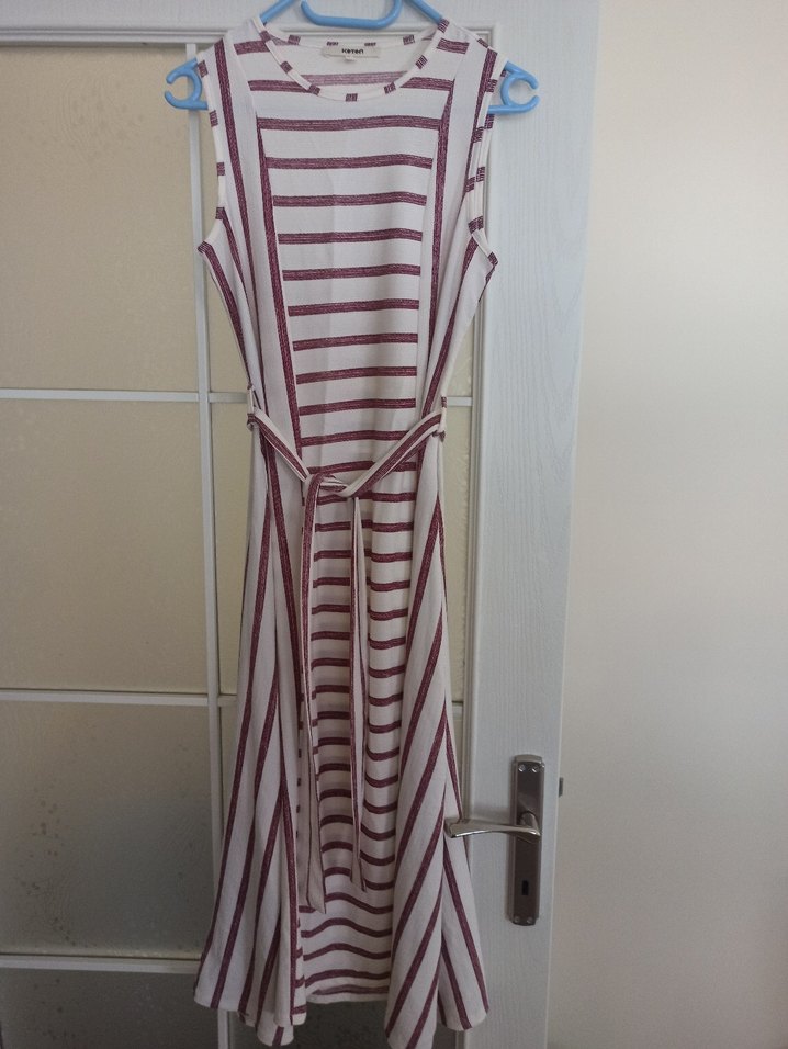 Bordo çizgili, kolsuz, tekne yaka uzun triko elbise. Belden kemerli, pileli tasarıma sahip, bohem ve Paris tarzını yansıtıyor. Günlük kullanıma uygun.