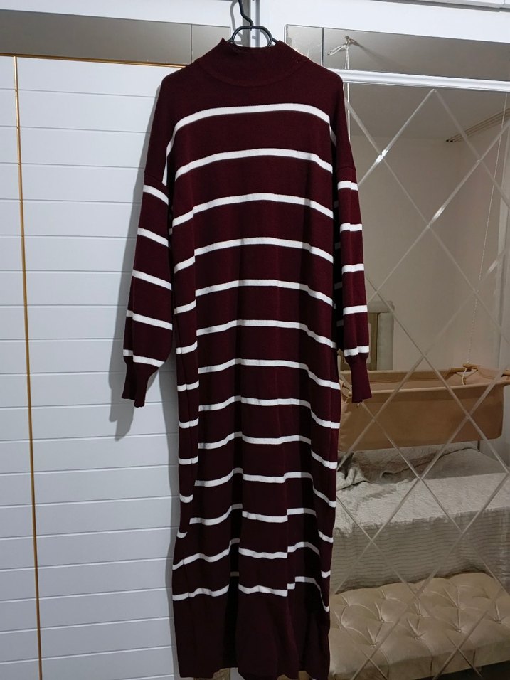 bi kac kez giyildi temiz hasarsiz strandart elbise Bordo renkli, yüksek yakalı ve uzun kollu, bol kesim triko elbisedir. Çizgili deseniyle günlük rahat sokak stili sağlar.