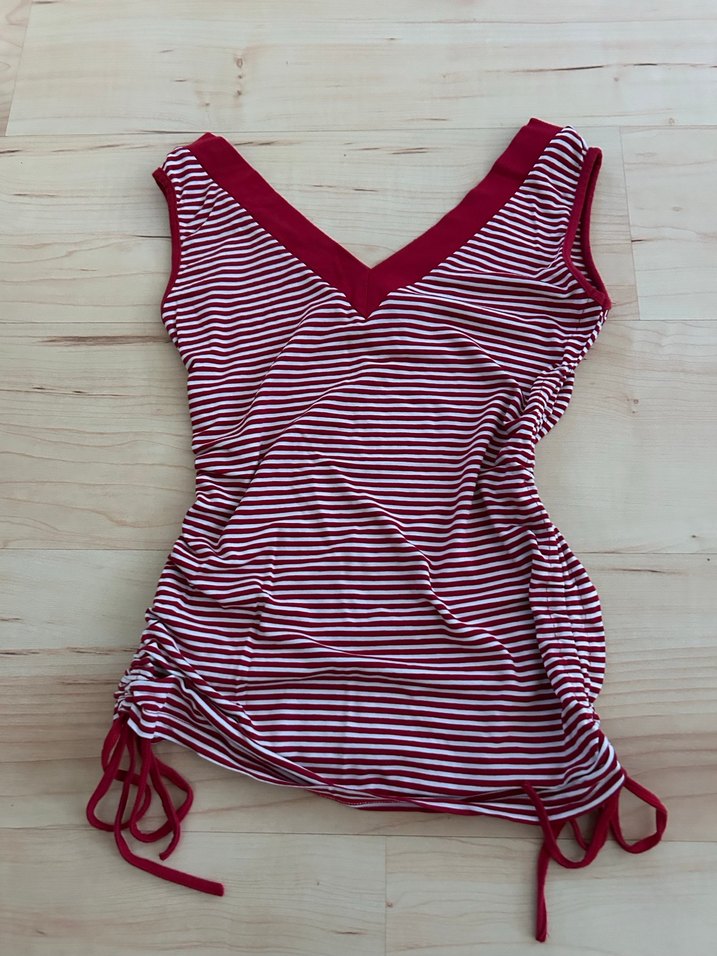 Kolsuz, V yaka likralı bluzu, bordo ve beyaz çizgili, pilili detaylı. Midi boy, yanlarda ayarlanabilir bağcıklar. Günlük sokak stili için uygun.
