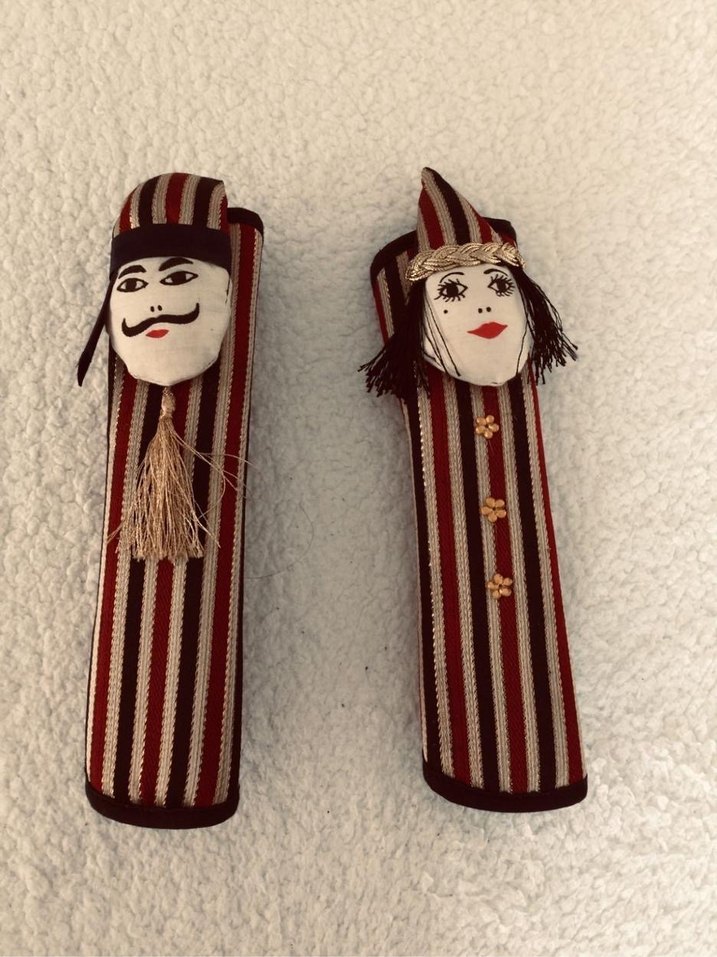 Bordo çizgili kumaştan yapılmış, yüz detayları olan iki bebek. Biri bıyıklı, diğeri uzun saçlıdır. Geleneksel el yapımı görünümde. Beyrut’tan alınmış içi süngerli dişi kımızı,lacivert,altın renkli kumaşla kaplı buzdolabı tutacağı yada başka bir amaçla kullanılacak Lübnan a özgü kadın ve erkek folklorik kıyafetli ürün.Hiç kullanılmamış,temiz ve sağlamdır.24 cm