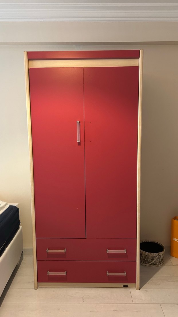 bordo renkte, iki kapaklı ve iki çekmeceli çocuk gardırop, kulplarla geniş saklama alanı sunar. bir kulpu yok ( gonderim saglanmamaktadir gelip teslim alinmaya uygundur)
