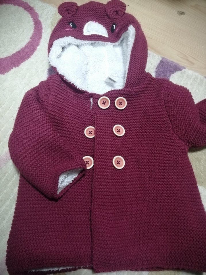 Bordo renkli, triko kumaştan yapılmış, kapüşonlu ve ayıcık kulaklı unisex çocuk kabanı. Çift düğmeli ve yumuşak astarlı, dar kesim.9-12 Ay bebek hırka. Üst iliğinde sökülme var dikilebilir bide kolunun birinde bi kaç tane ip çıkmıs onarılabilir