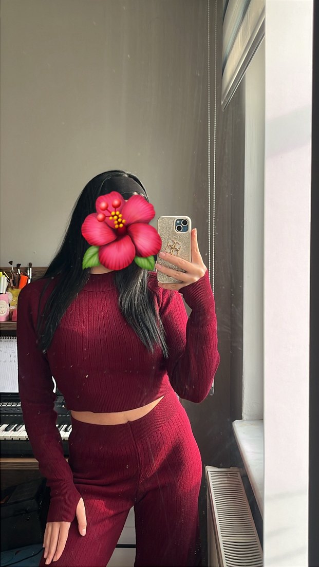 Yumuşak dokulu bordo crop top ve pantolon takımı, uzun kollu ve yüksek yakalı, vücuda oturan bir siluete sahip.