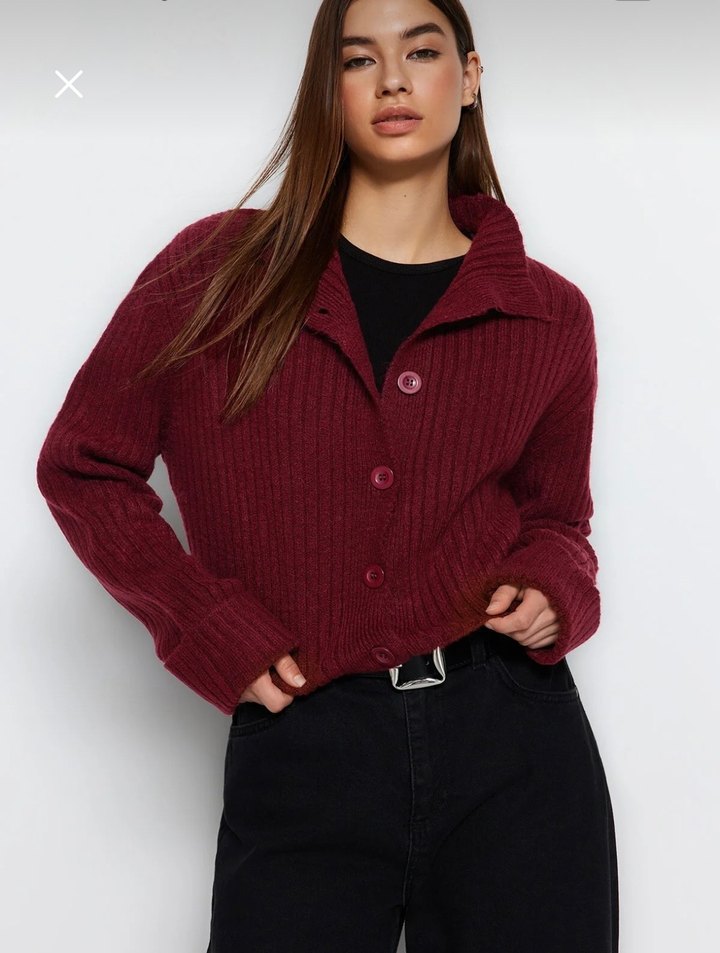 Bordo Crop Yumuşak Dokulu Dik Yaka Triko Hırka