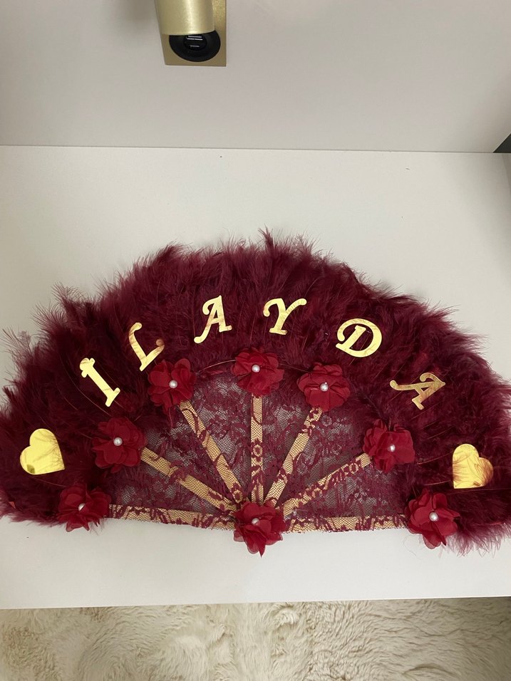 Bordo dantel ve tüylerle süslenmiş bohem kına yelpazesi, altın harflerle kişiselleştirilmiş. Retro ve hippie tarzlar için uygun. 1 kez kullanılmıştır