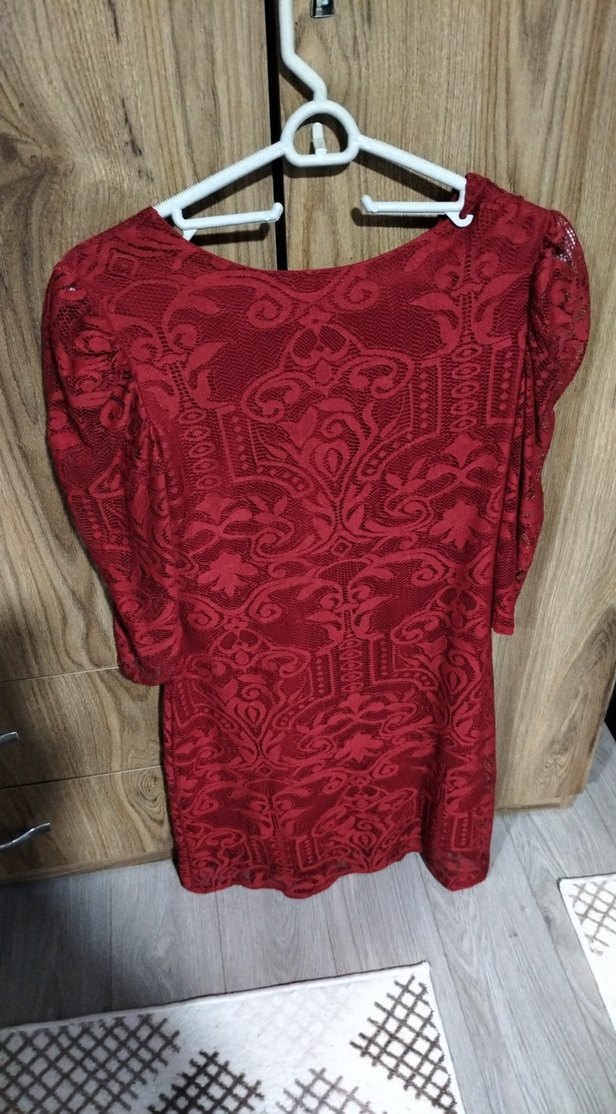Bordo renkli, dantel desenli, yuvarlak yakalı, uzun kollu, bol kesim ve midi boyda bohem tarzda kadın elbise