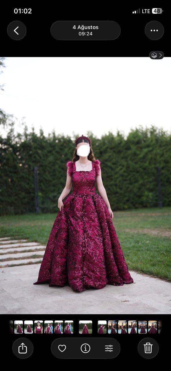 Bordo renkli, dantel desenli, uzun ve straplez gotik nişan elbisesi, vücuda oturan kesimiyle dikkat çekiyor. Kollarında ki püskülleri sonradan eklenmiştir. Arkası ipliklidir 36 ve 38 bedene uygundur.