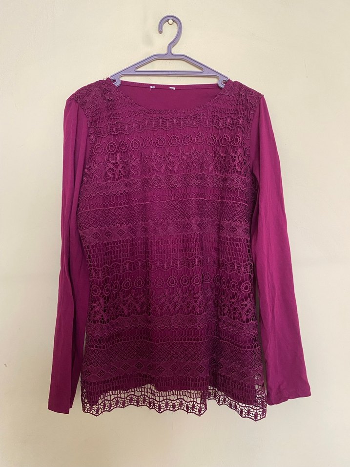 Bordo renkte, uzun kollu, yuvarlak yakalı, dantel detaylı ve bol kesim bohem tarzda kadın bluz.