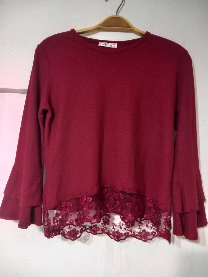 Bordo renkli, uzun kollu, yuvarlak yakalı triko bluz. Loose fit ve dantel işlemeli etek ucu detaylarıyla bohem tarzda.
