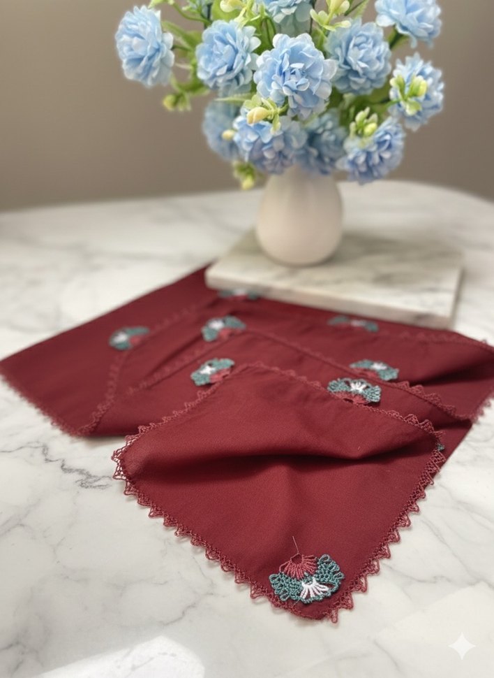 Bordo renkte, dantel işlemeli ve çiçek nakışlı tekstil fular. Bohem ve retro tarzını yansıtan detaylarıyla hippie görünümüne uygun bir aksesuardır.