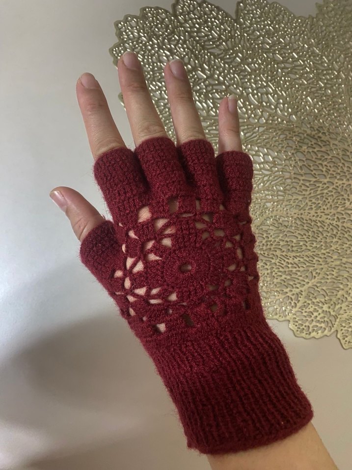 El örgüsü bordo renkli parmaksız eldiven. hediye olarak geldi ve hiç kullanılmadı kusuru yoktur