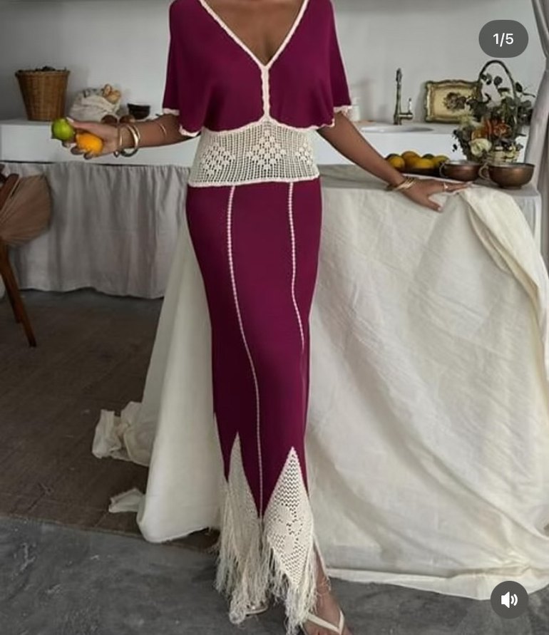 Yumuşak örme kumaştan bordo bohem uzun elbise, V yakalı ve dantel detaylıdır. Etnik desenler ve ince askılı kollar içerir, düğünler için uygundur.