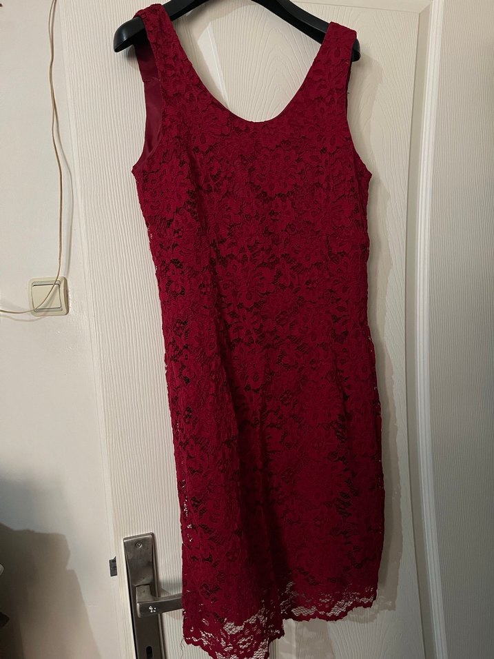 Bordo renkte, dantel detaylı, V yakalı, kolsuz ve vücuda oturan elbisedir. Romantik akşamlar için uygundur. Bir kez giyildi