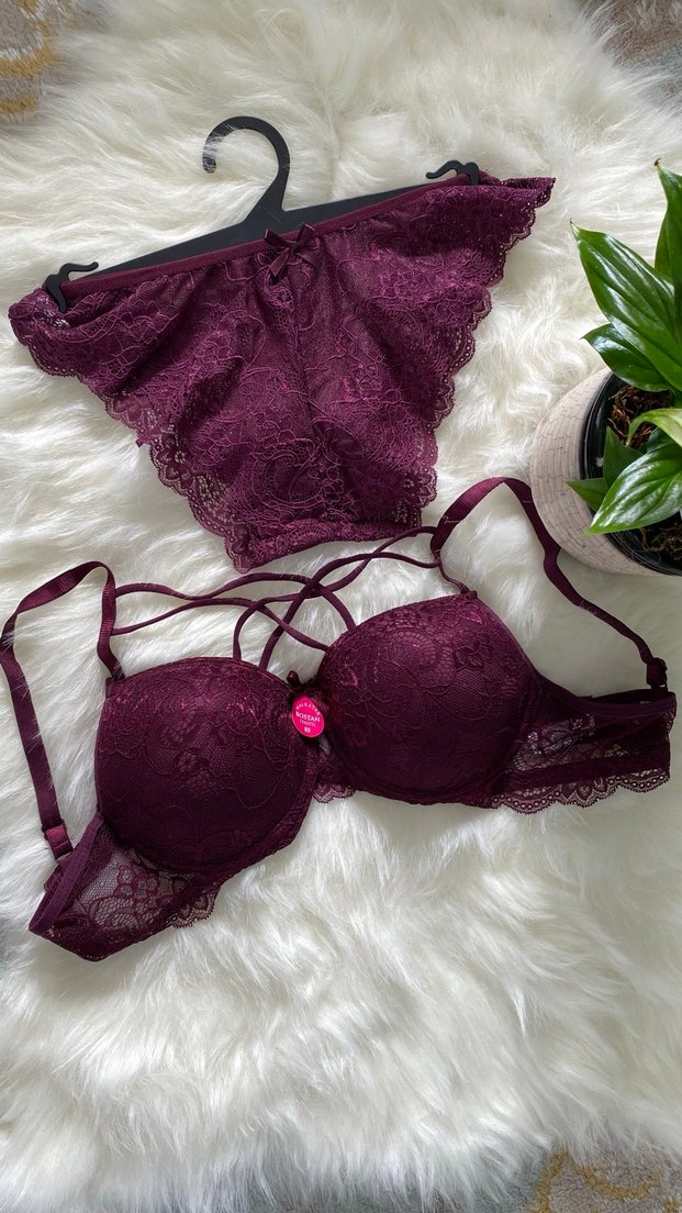 Bordo renkli sütyen ve midi külot, koyu dantel detayları ve bantlı tasarımıyla rahat goth tarzı sunar. Desensiz ve yumuşak dokuludur.