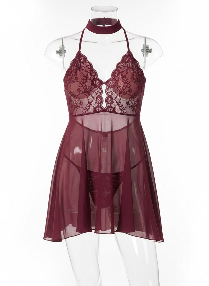 Bordo renkte, dantel detaylı ve askılı, şeffaf midi boyda, vücuda oturan gotik tarzda kadın gecelik. Desensiz, koyu renklidir.