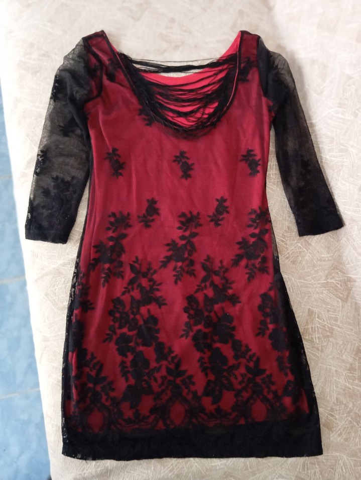 Bordo renkli, dantel kaplamalı, oturan kesim midi elbise. Uzun kollu, tekne yaka ve gotik desenlerle cesur bir tarz sunar.