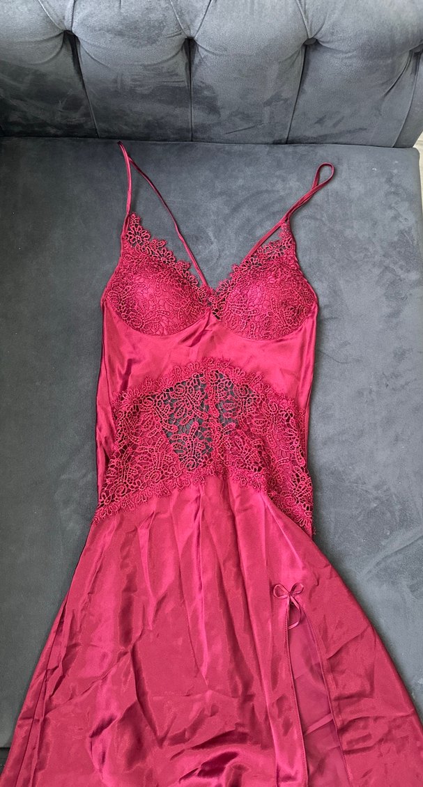Bordo renkli, ince askılı ve vücuda oturan midi gecelik, dantel detayları ile dikkat çekiyor. Göğüs ve bel kısmında zarif dantel işçiliği bulunur.